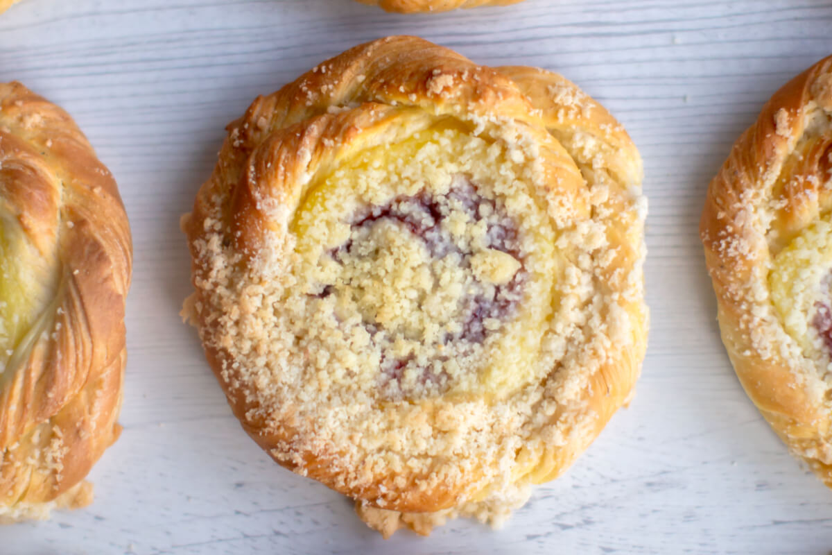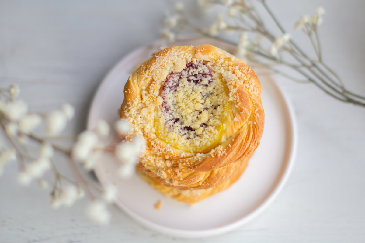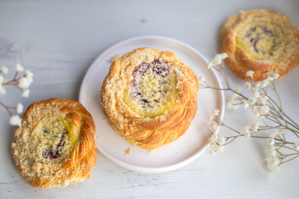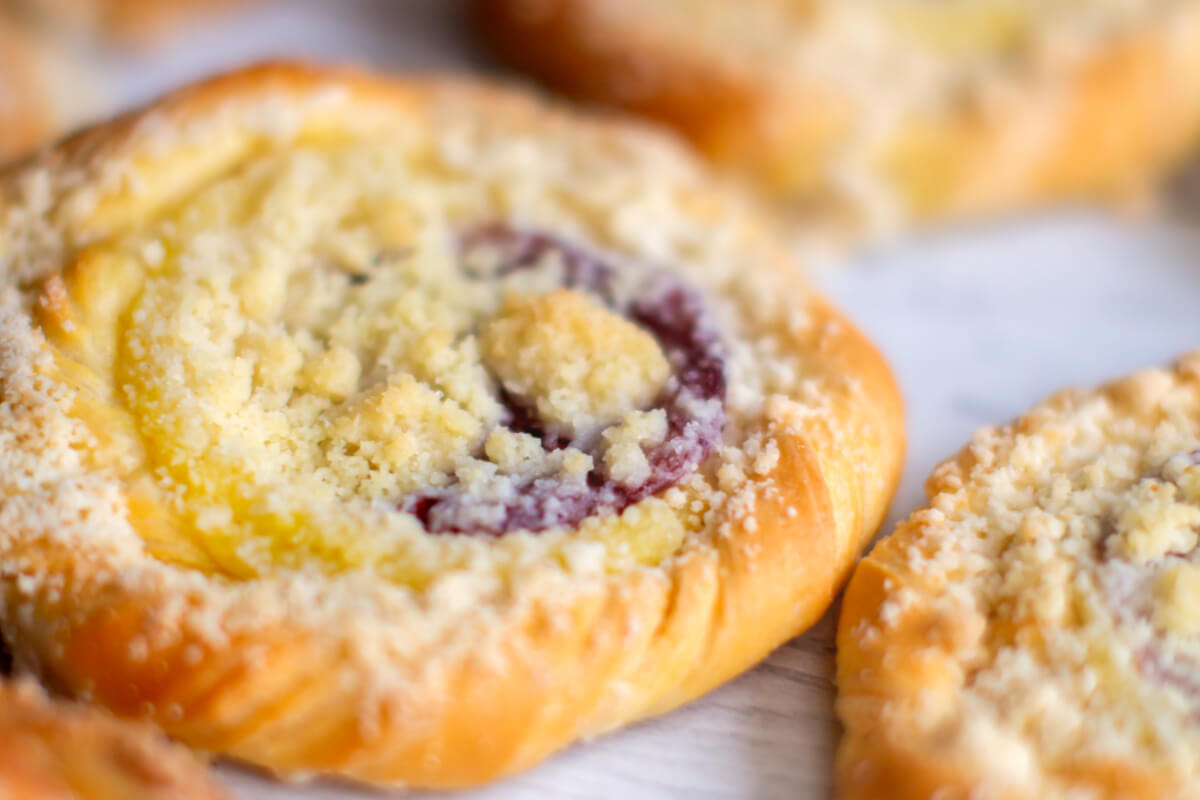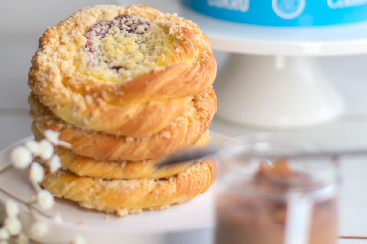 Puszyste ciasto drożdżowe z kruszonką, budyniem i nadzieniem truskawkowym. Bez dodatku cukru. Zawiera naturalnie występujące cukry.