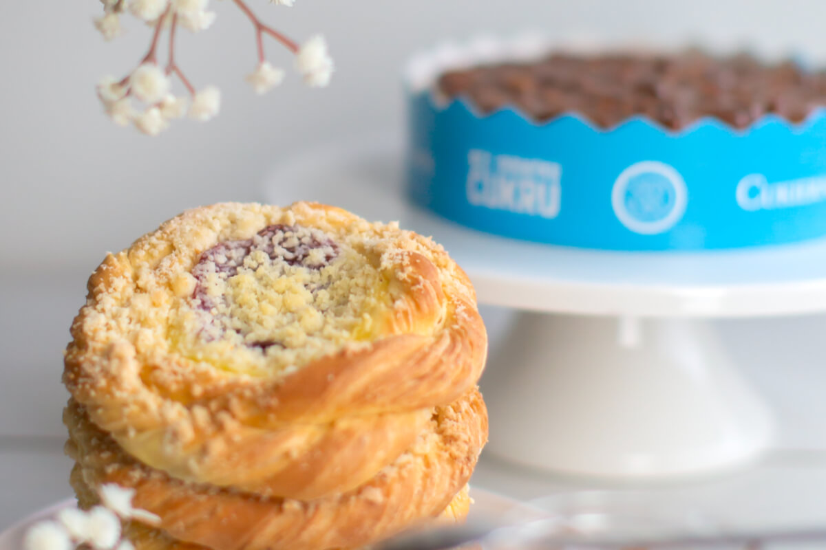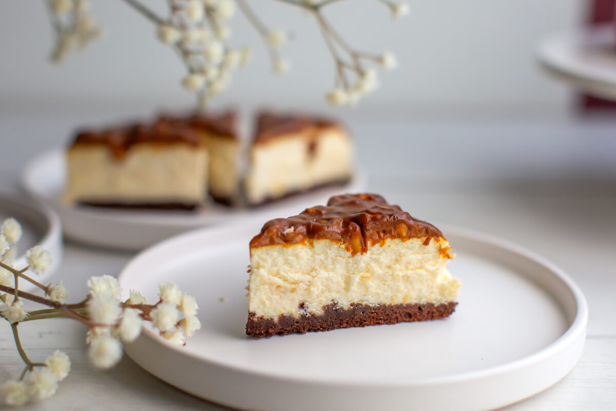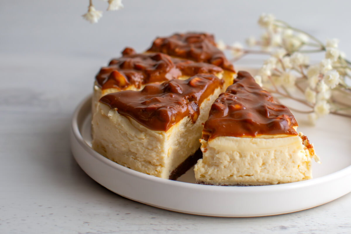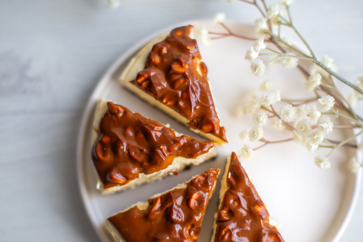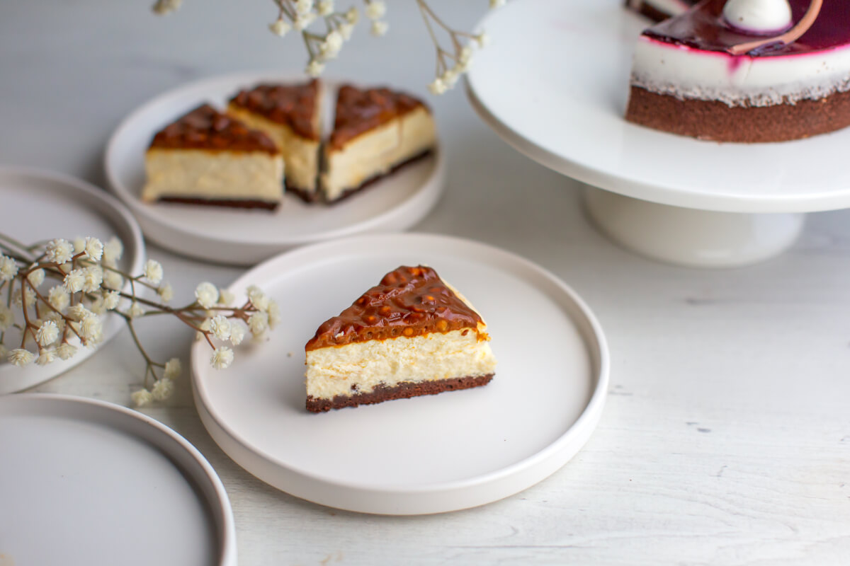 Dark sponge cake with cheesecake filling, topped with caramel glaze and peanuts. No added sugar. Contains naturally occurring sugars