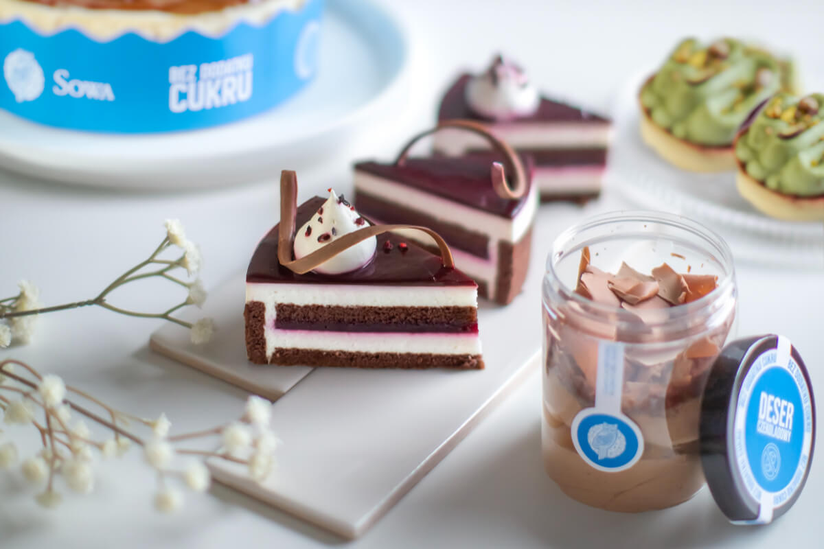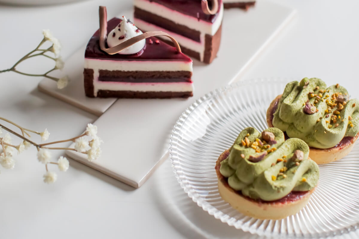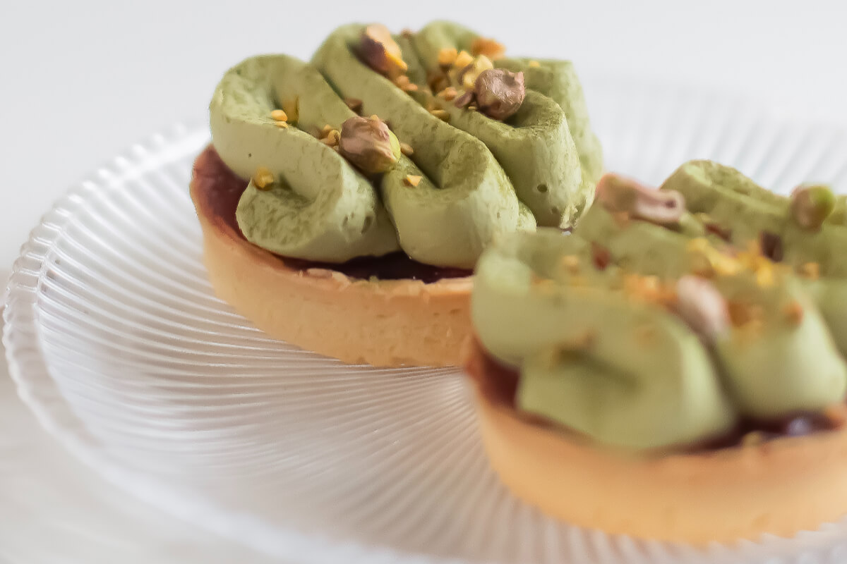 Shortcrust base with strawberry filling and pistachio cream. No added sugar. Contains naturally occurring sugars.