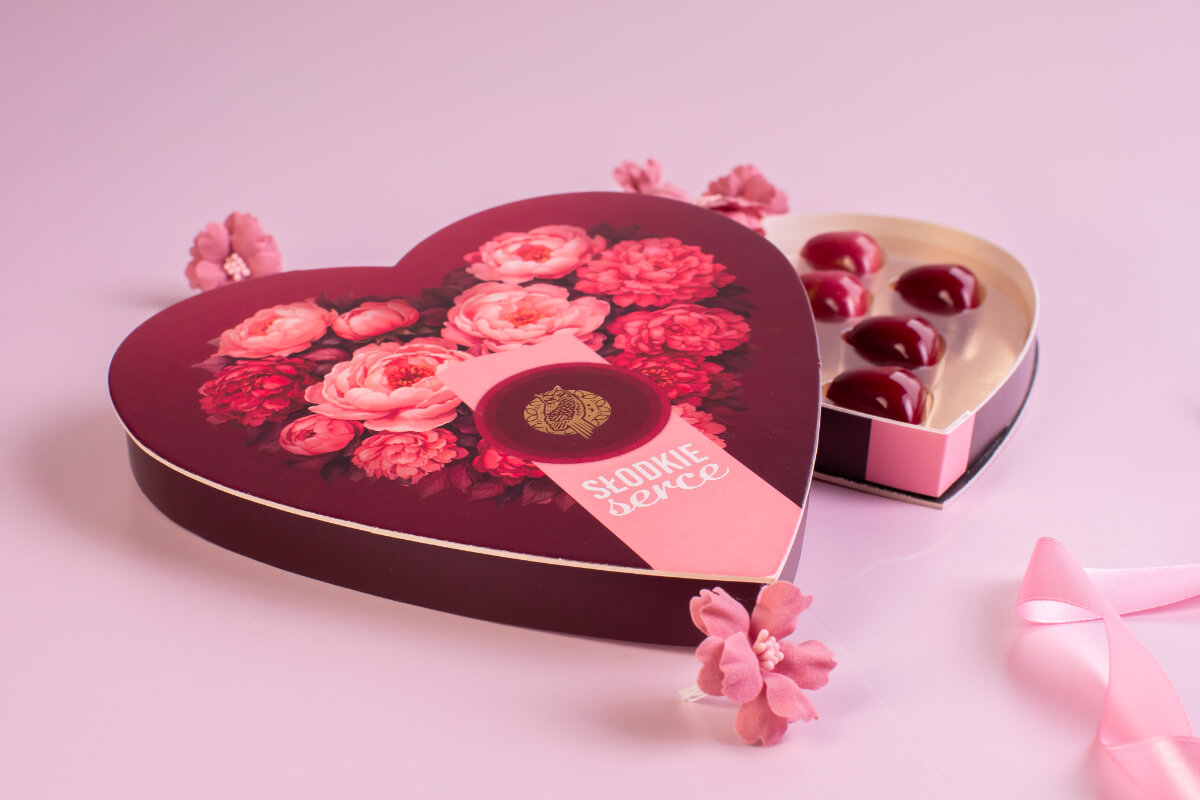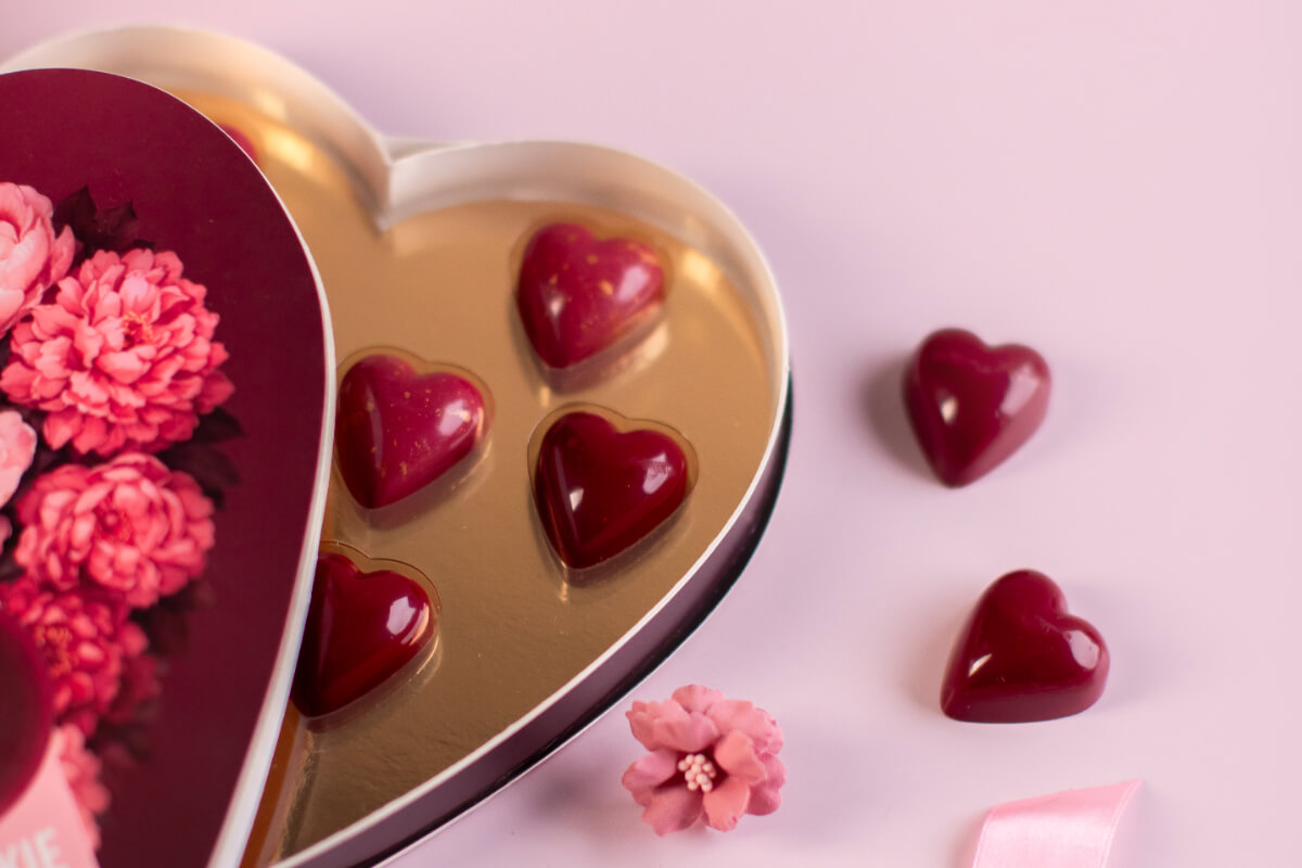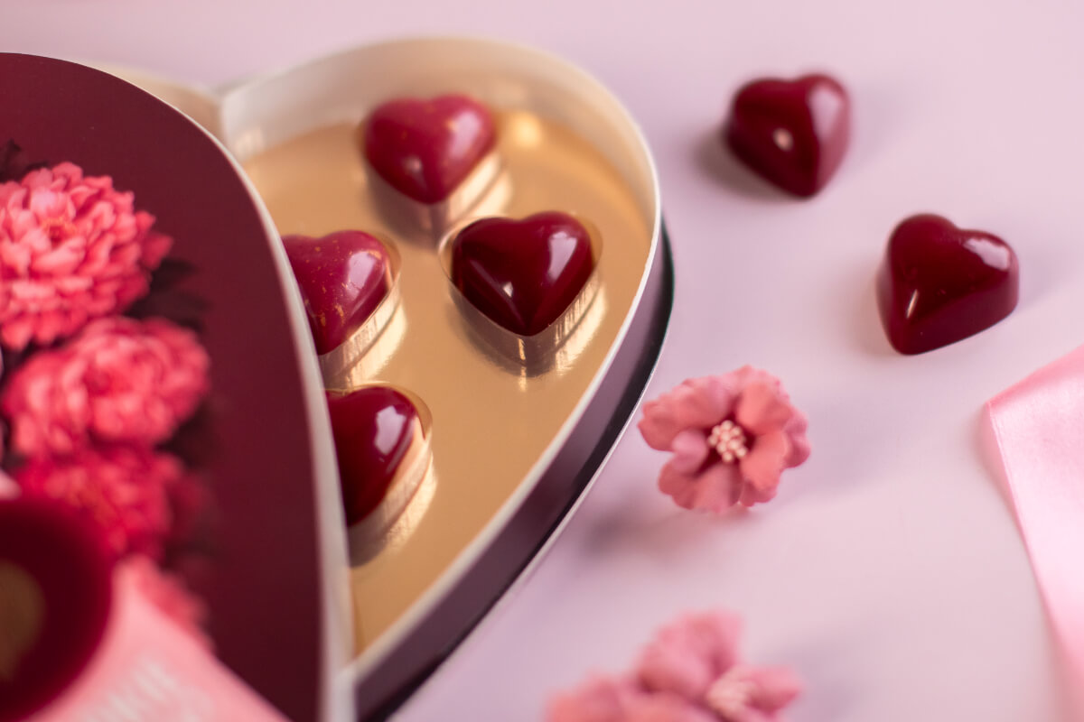 Zestaw pralin w kształcie serduszek: z czekolady rubinowej z ganaszem o smaku pomarańczowym oraz z czekolady mlecznej z ganaszem o smaku kawowym.